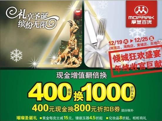 1F:新柜上架:雍翠緣、丸美、老鳳祥 DHC滿300減50 六福、黃金、鉑金9.6折,鑲嵌、K金滿1000送250。 周大福 鑲嵌類8.6折。 2F:Esprit、G2000、依戀400元現金換800元折扣B券。 3F:古色400元現金換800元折扣B券。 李紅400元現金換1000元折扣A券。 5F:匡威 新款8折、特價4折、滿300元送圣誕精美小禮品。 6F:米奇妙童裝400元現金換800元折扣B券。