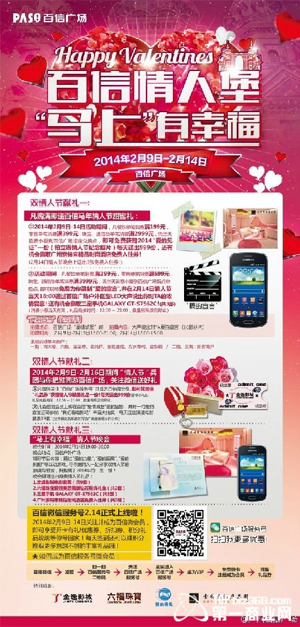 廣州百信廣場:百信情人堡 馬上有幸福@廣州百信廣場:百信情人節 “馬上”有幸福。當情人節遇上元宵節,會是怎樣的一種邂逅?來百信,馬上有幸福!①參與愛情活動,贏取精品時尚酒店入住券或三星手機!②關注“百信廣場服務號”并成為微會員,領禮品,贏電影套票!③“馬上有幸福 ” 情人節晚會~千份大獎,等你來領取!(來自廣州百信廣場新浪微博)