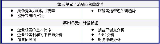 本次課程,分四個單元,從銷售管理的概念和架構談起,細數銷售管理的模塊組成;進而談到銷售計劃的制定,一切從細節入手,消費者分析,自然因素分析,人文因素分析,競爭對手分析,商品組成分析,因素考量決定計劃制定;第三部分重點講述賣場競爭力的構成要素及銷售提升的方法,顧問老師啟用大量經典案例結合最新發展趨勢,激活學員的內在潛能;最后一部分詳述數字化在百貨銷售中的運用,精兵簡政,高效運作。