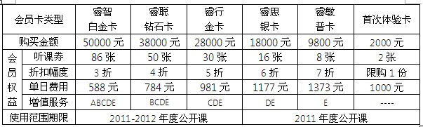 說明: 1.2011年度起,參加百貨零售行業公開課程的學員,每人每天需提交聽課券1張(特別優惠場次除外,詳見各期課程通告)。 2.上述費用已包括發票稅、學費、印刷版教材費、午餐費、課間茶點、培訓證書及學員合影費用。 3.首次體驗卡每間零售企業限購一份(包括連鎖零售企業)。 4.增值服務項目類型: A.免費提供《卓越服務三步曲之待客有道》或《樓層管理訓練營》或《VIP顧客服務及營銷策略》內訓課程1天。(客戶需另行承擔導師往返差旅及當地食宿費用) B.提供賣場環境及營運管理現場輔導1天。(客戶需另行承擔顧問往返差旅及當地食宿費用) C.提供年度營銷計劃或年度培訓計劃書面輔導1次 D.贈送《百貨公司營運手冊》1套 E.贈送《百貨公司樓管操作手冊》1套