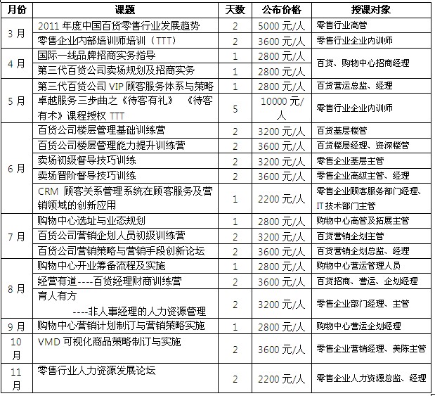 說明: 1.2011年度起,參加百貨零售行業(yè)公開課程的學(xué)員,每人每天需提交聽課券1張(特別優(yōu)惠場次除外,詳見各期課程通告)。 2.上述費(fèi)用已包括發(fā)票稅、學(xué)費(fèi)、印刷版教材費(fèi)、午餐費(fèi)、課間茶點(diǎn)、培訓(xùn)證書及學(xué)員合影費(fèi)用。 3.首次體驗(yàn)卡每間零售企業(yè)限購一份(包括連鎖零售企業(yè))。 4.增值服務(wù)項(xiàng)目類型: A.免費(fèi)提供《卓越服務(wù)三步曲之待客有道》或《樓層管理訓(xùn)練營》或《VIP顧客服務(wù)及營銷策略》內(nèi)訓(xùn)課程1天。(客戶需另行承擔(dān)導(dǎo)師往返差旅及當(dāng)?shù)厥乘拶M(fèi)用) B.提供賣場環(huán)境及營運(yùn)管理現(xiàn)場輔導(dǎo)1天。(客戶需另行承擔(dān)顧問往返差旅及當(dāng)?shù)厥乘拶M(fèi)用) C.提供年度營銷計劃或年度培訓(xùn)計劃書面輔導(dǎo)1次 D.贈送《百貨公司營運(yùn)手冊》1套 E.贈送《百貨公司樓管操作手冊》1套