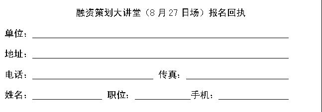 主講專(zhuān)家:朱耿洲博士,中國(guó)資本策劃研究院院長(zhǎng),我國(guó)著名融資實(shí)戰(zhàn)策劃專(zhuān)家,"融資策劃36計(jì)"創(chuàng)始人,20年金融管理、法律顧問(wèn)、企業(yè)咨詢(xún)顧問(wèn)、投融資顧問(wèn)實(shí)戰(zhàn)經(jīng)驗(yàn),曾擔(dān)任300多家企業(yè)融資顧問(wèn)以及市長(zhǎng)金融顧問(wèn)。 主辦單位:中國(guó)資本策劃研究院。 支持單位:廣東民營(yíng)企業(yè)商會(huì),廣東民營(yíng)企業(yè)進(jìn)出口商會(huì),廣東省連鎖經(jīng)營(yíng)協(xié)會(huì),廣東省包裝行業(yè)商會(huì),廣東省資源綜合利用協(xié)會(huì),廣東省電子商務(wù)協(xié)會(huì),廣東油氣商會(huì),廣州市私營(yíng)企業(yè)協(xié)會(huì),廣州市越秀區(qū)僑商會(huì),華商精英俱樂(lè)部(排名不分先后)。 承辦單位:廣州市廈天管理顧問(wèn)有限公司。 邀請(qǐng)對(duì)象:各大行業(yè)協(xié)會(huì)、商會(huì)負(fù)責(zé)人;企業(yè)董事長(zhǎng)、總經(jīng)理、財(cái)務(wù)總監(jiān)、投融資經(jīng)理。 時(shí)間地點(diǎn):2008年8月27日(周三)下午14:30-17:30,廣州麓湖高爾夫球鄉(xiāng)村俱樂(lè)部泳景臺(tái)。 參加辦法:填寫(xiě)報(bào)名回執(zhí),于2008年8月20日(周三)前回傳至活動(dòng)聯(lián)系人陳小姐