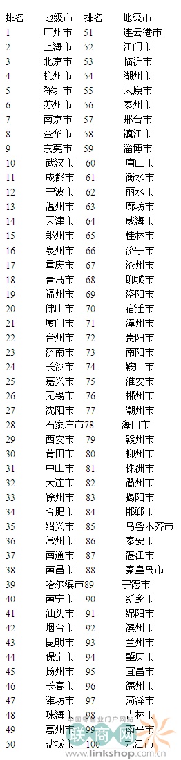 在《2010年網商發展指數報告》推出全國31個省市(未含香港、澳門和臺灣)網商發展指數排名基礎上,網商發展指數系列報告首次推出了網商發展指數百強城市排名,廣州、上海、北京、杭州、深圳、蘇州、南京、金華、東莞、武漢位列網商發展指數百強城市排名前十位。